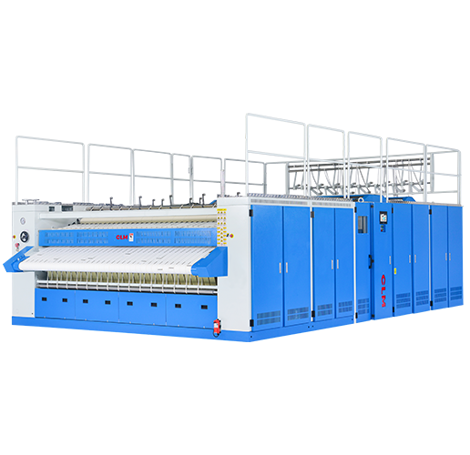 4輥2槽熨平機,采用2組直徑650mm的輥式烘筒與2個直徑1200mm的柔性燙槽相結合,先由4個輥式烘筒對濕度過高的布草進行水分蒸發(fā)和熨燙,后由2個柔性燙槽進行熨干和定型,有效規(guī)避了純槽燙對蒸汽高壓力的要求,同時避免了單機脫水水分過高不能熨燙的弊端,輥筒雙面熨燙與槽燙完美結合,與純槽燙相比大幅降低蒸汽消耗,并且可以在保證熨燙效率的同時提升布草熨燙的平整度。